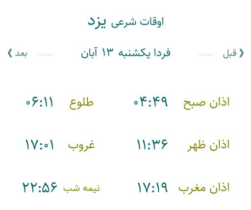 اوقات شرعی فردا ۱۳ آبان ۱۴۰۳ به افق یزد (احتیاط یک تا دو دقیقهای لحاظ شود)