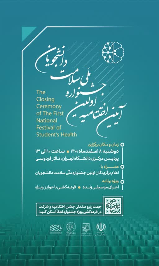 آیین اختتامیه اولین جشنواره ملی سلامت دانشجویان در روز دوشنبه ۸ اسفندماه، ساعت ۱۰ الی ۱۳ در پردیس مرکزی دانشگاه تهران، تالار فردوسی برگزار خواهد شد.