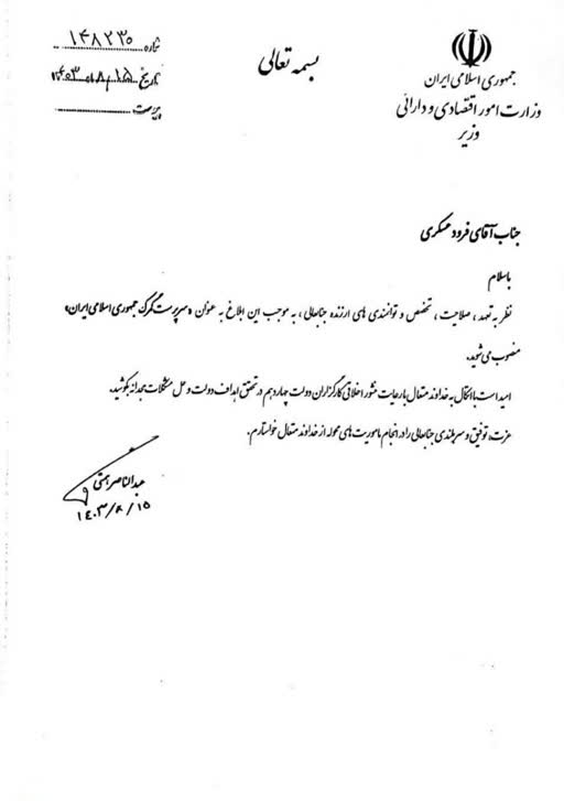 با حکم وزیر اقتصاد؛ فرود عسگری سرپرست گمرك ایران شد.